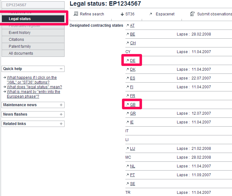 Many European patents are validated in United Kingdom (UK/GB), France (FR) and Germany (DE). This results in equivalent national patents in each of these countries. Obtaining status information on these individual national patents is getting easier everyday.