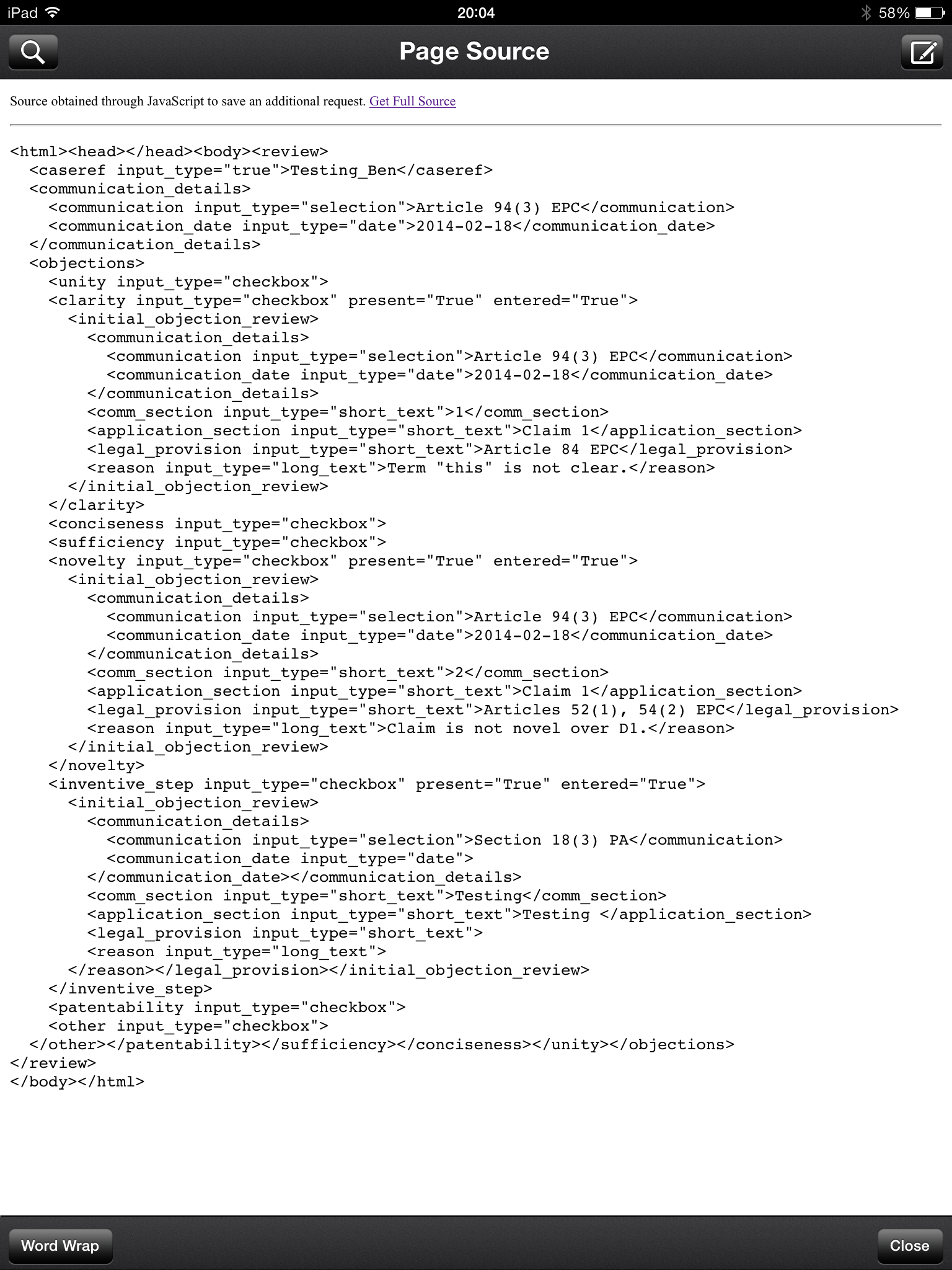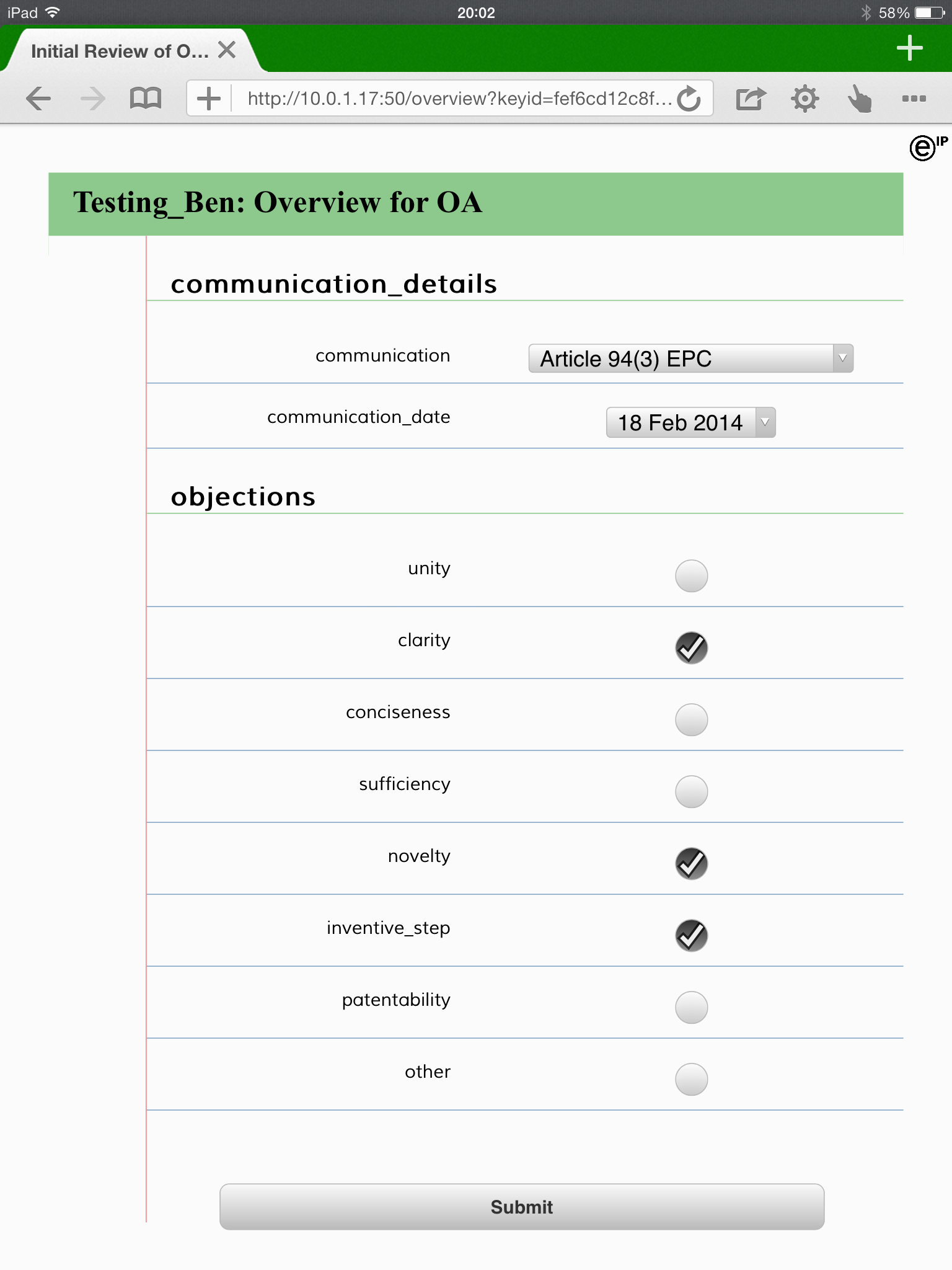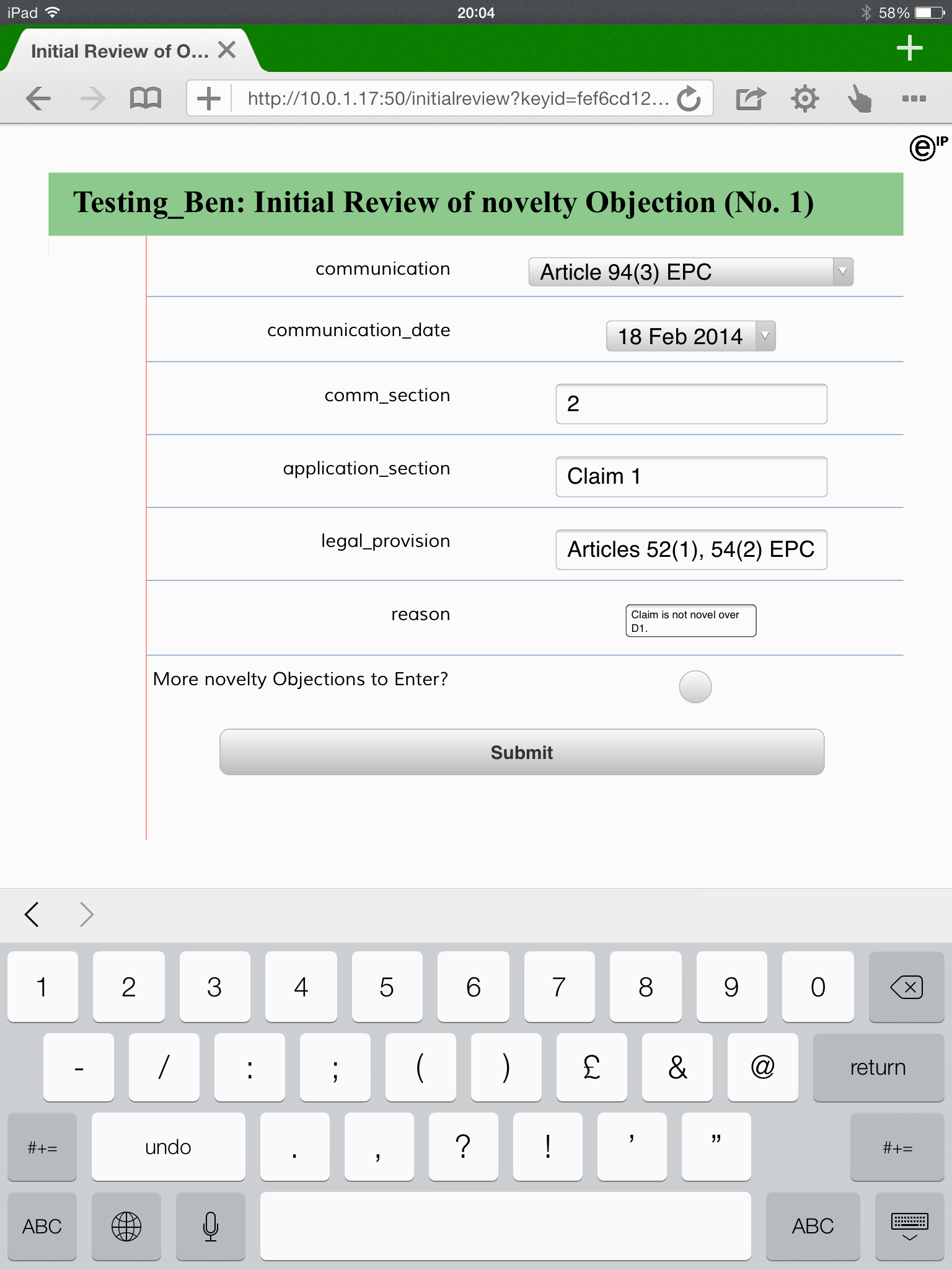 I have similar review workflows in progress for novelty and inventive step. They follow a similar pattern: an XML template defines data entry and works the user through a number of review steps. I have JavaScript functions that breaks down a claim into features – I can use this as a front-end for my novelty review. Inventive step has a different process for each of the UK, Europe and US, wherein the process incorporates the current practice from case law.