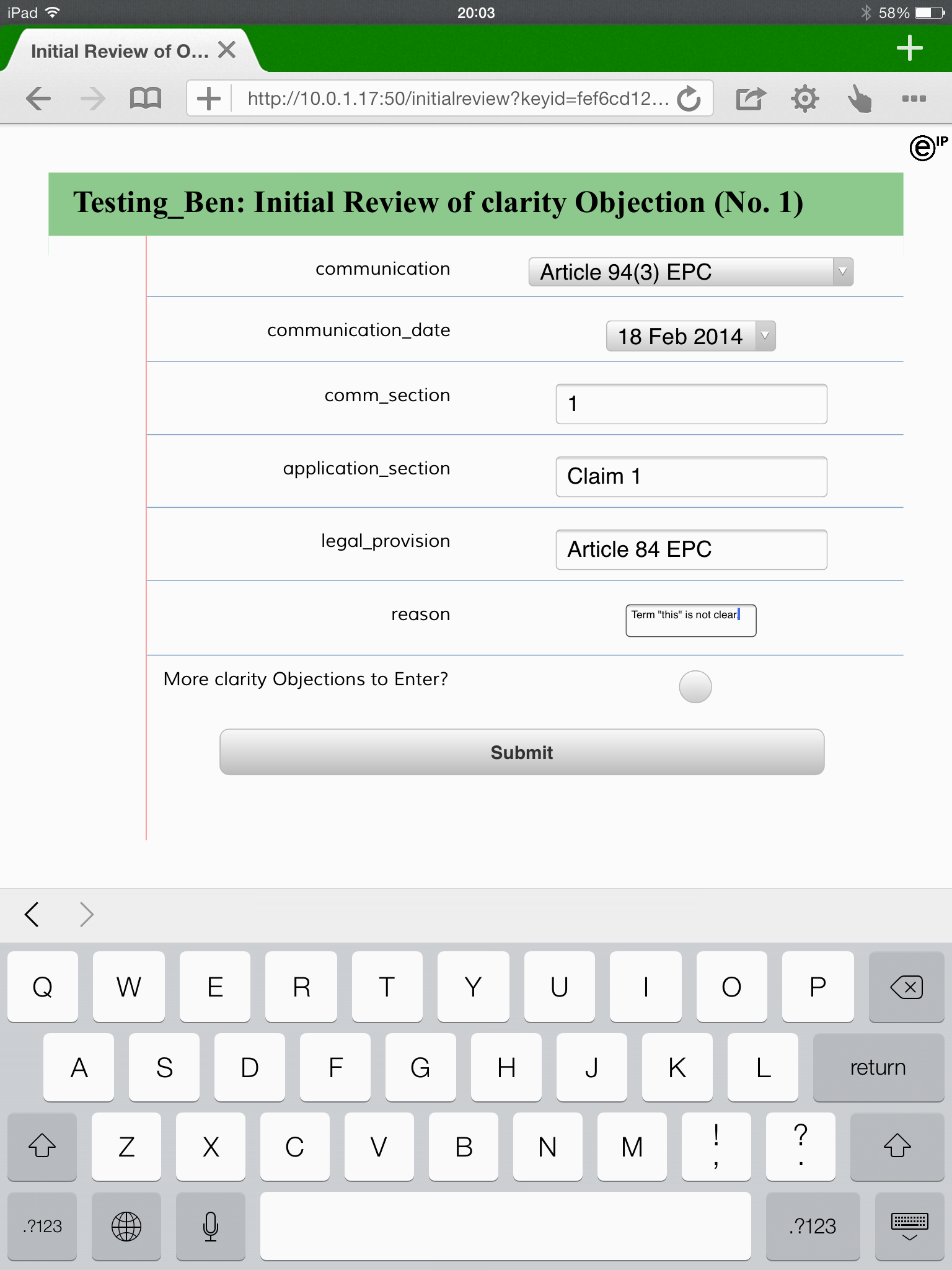 Then we briefly enter salient details of each objection raised in the communication. This can be used for reporting and as a reference for a later, more detailed review: