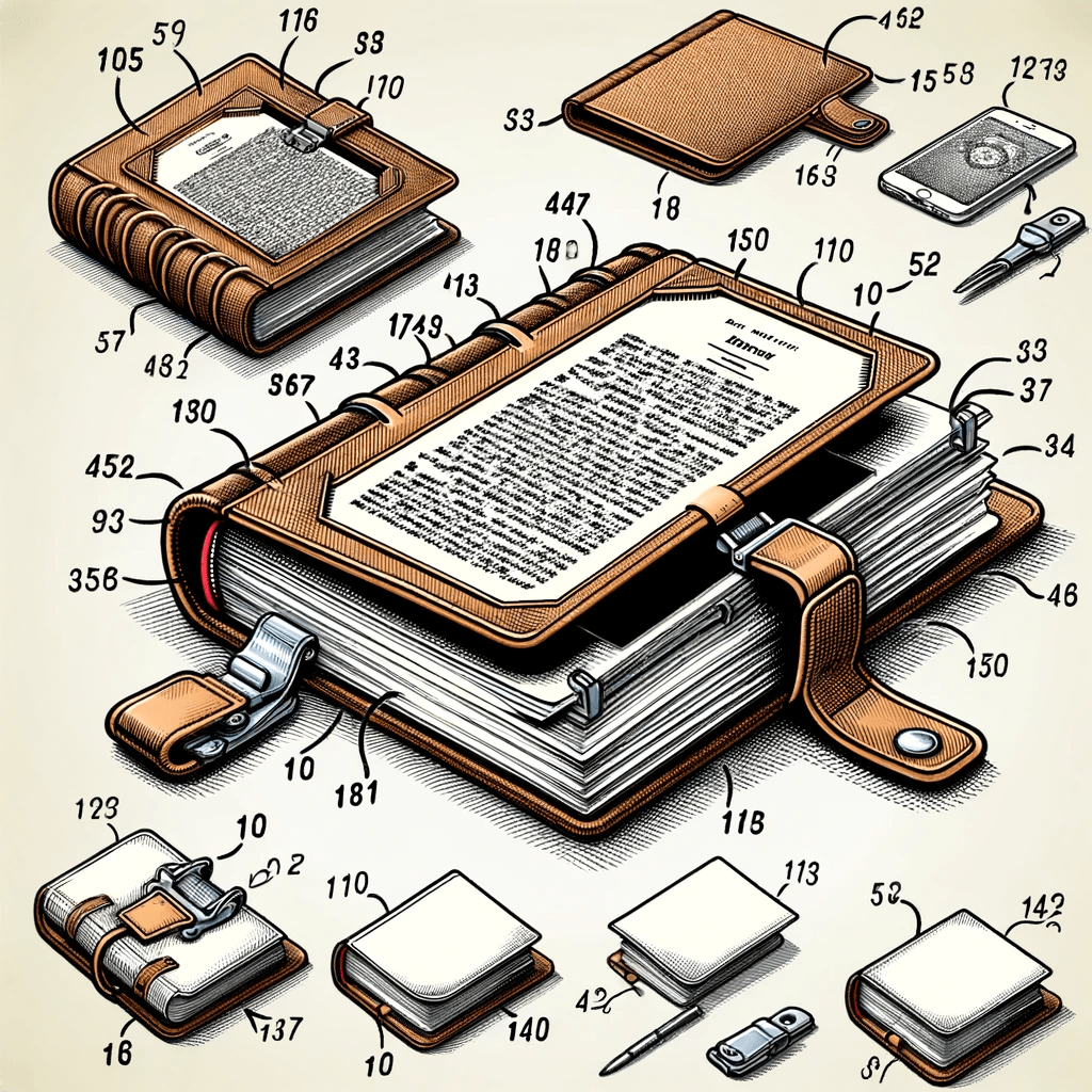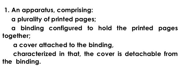 Looking closely, we see that actually those text portions are centred on different things. The claim defines an “apparatus“, that forms the top line. This apparatus has a number of components: pages, a binding, and a cover. We see that the middle three segments are based around definitions of each of these components. The last section then defines a characteristic of the apparatus in terms of the cover and binding components.