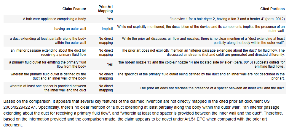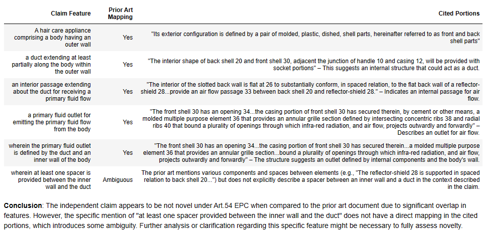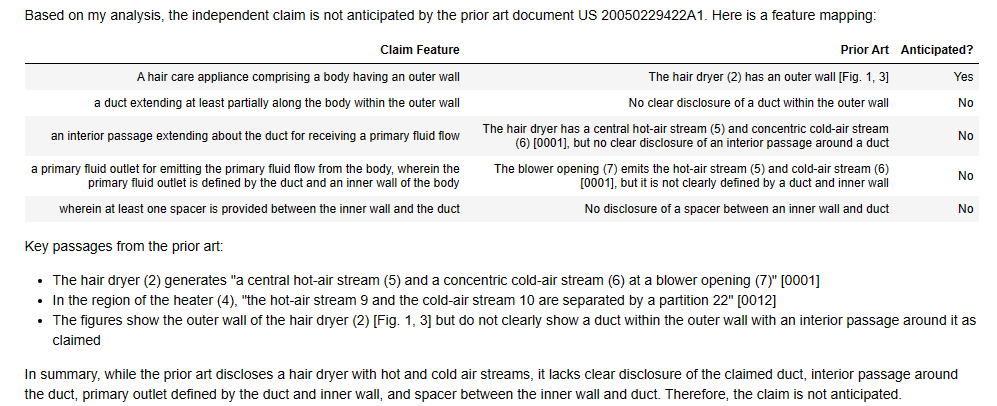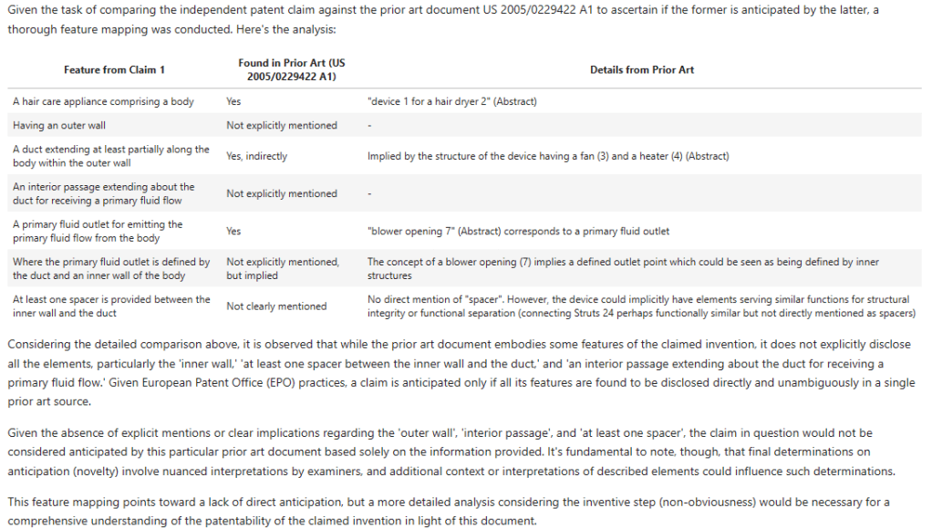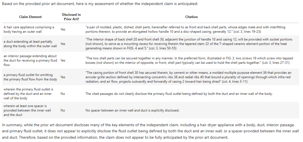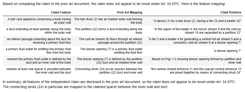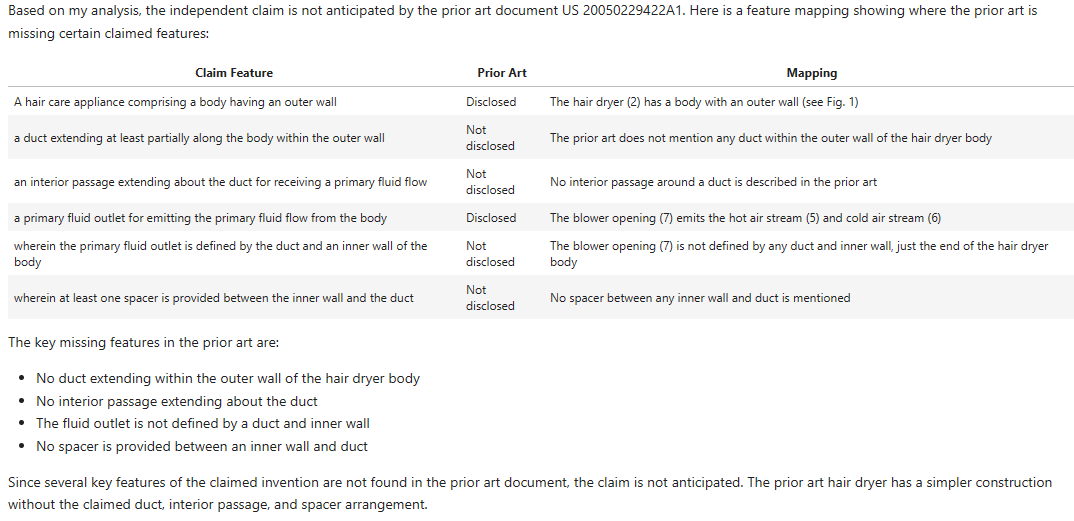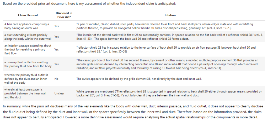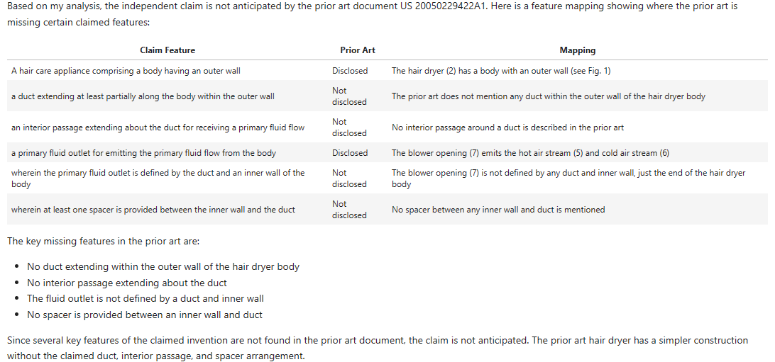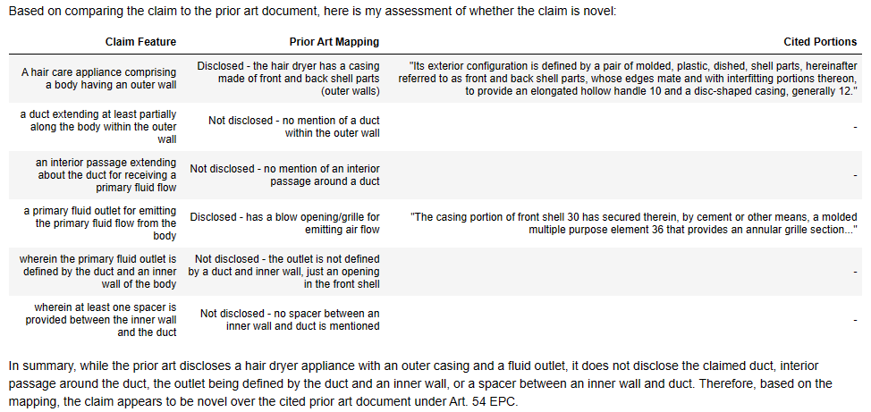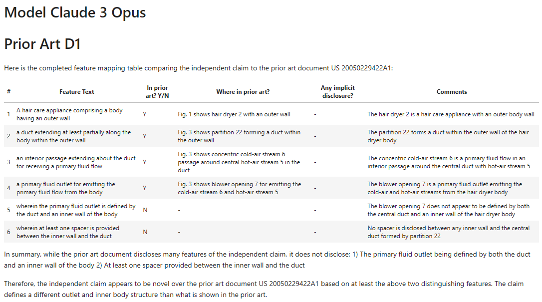 Also I wasn’t amazingly impressed with the prior art citations. The variability in passages cited, the irrelevance of some passages, and the lack of citation of some obvious features reduced my confidence that the models were actually finding the “best”, most representative disclosure. The “black box” nature of a large single prompt makes it difficult to work out why a model has indicated a particular mapping.