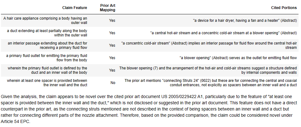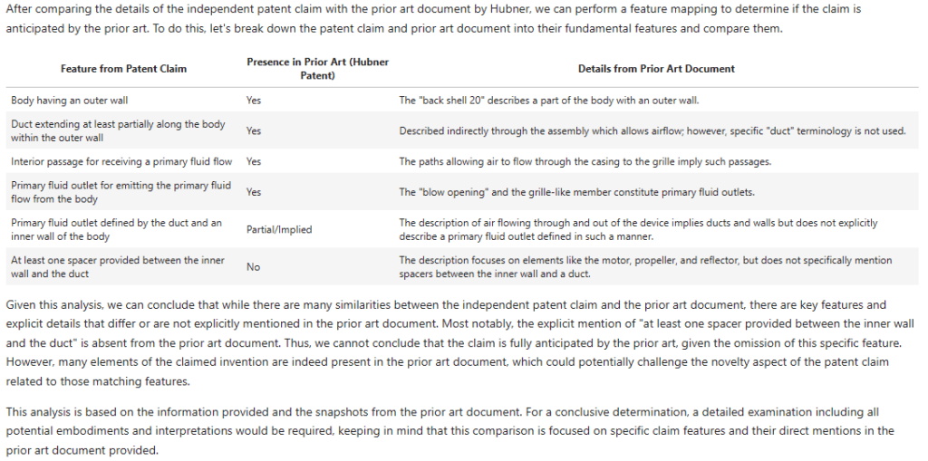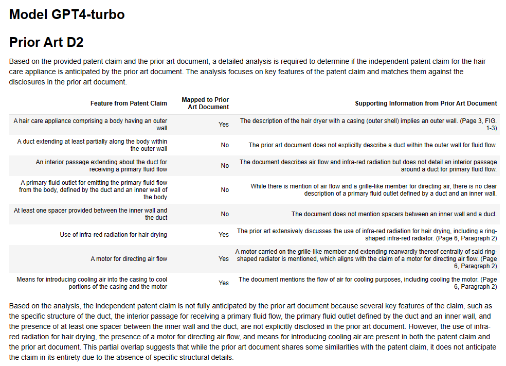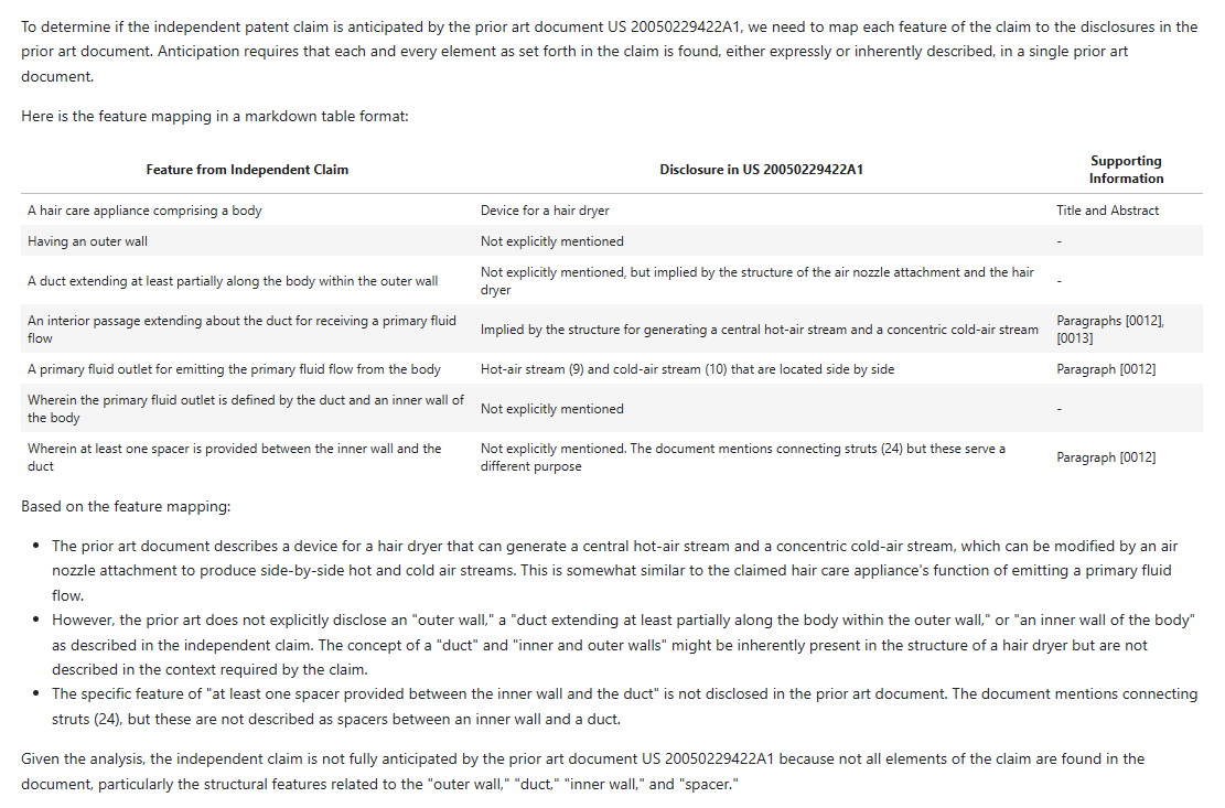 Often, a clear binary mapping (“Yes – the feature is disclosed”) leads the model to later justify that sampling (“The feature is disclosed because the feature is disclosed”) rather than provide useful analysis. We had better performance when we were less explicit in requiring a binary mapping. However, this then leads to problems in parsing the results – is the feature disclosed or not?