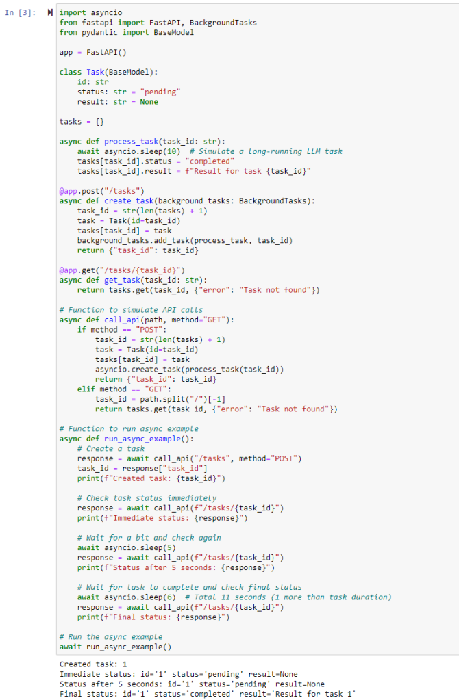 One problem I found is that lots of documentation, tutorials, and examples that feature FastAPI, SQLAlchemy/SQLModel and Pydantic assume a simple non-async use case where all your processing can be performed in your FastAPI route methods. This doesn’t work for LLM applications – if you are fetching anything from an LLM via a web-API (e.g., via the OpenAI or Anthropic Python clients), it will take too long for synchronous web handling – FastAPI is designed to return data quickly from a database in < 200ms, but LLM API calls can often take seconds to complete.